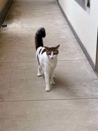 おはようございます^ ^ はなちゃん、今日は追いかけられました^ ^ シャーっていうのが無くなったので、ちょっとずつやけど慣れてきてるんかな? シッポの太さがスゴイでしょ?^ ^ 時間のある土日にも出てきてくれてたらもっと仲良くなれるやろうけど、飼い主…